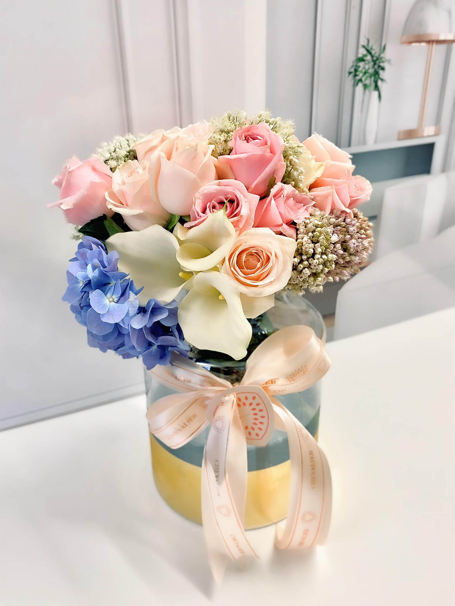תגיות: אגרטל, ורד, לבית, סידור מיוחד, פרחים ורודים, קאלה