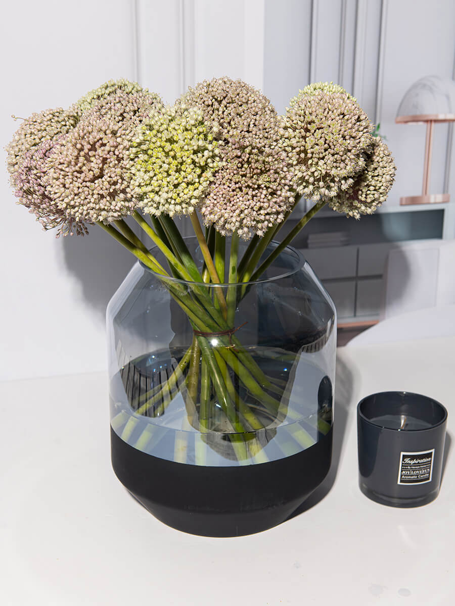 אגרטל זכוכית גדול ומרשים, המשלב בתוכו ראשי שום בגווני לבן סגול.