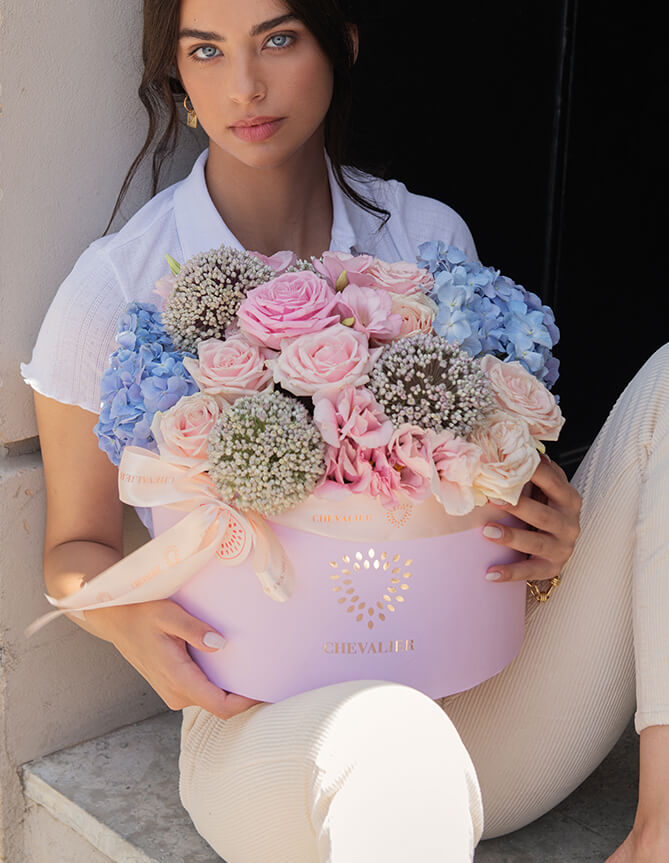 קופסת פרחים ענקית ומרשימה, המשלבת מגוון רחב של פרחים יוקרתיים ועדינים בשילוב גווני יוצא דופן של ורוד ותכלת.