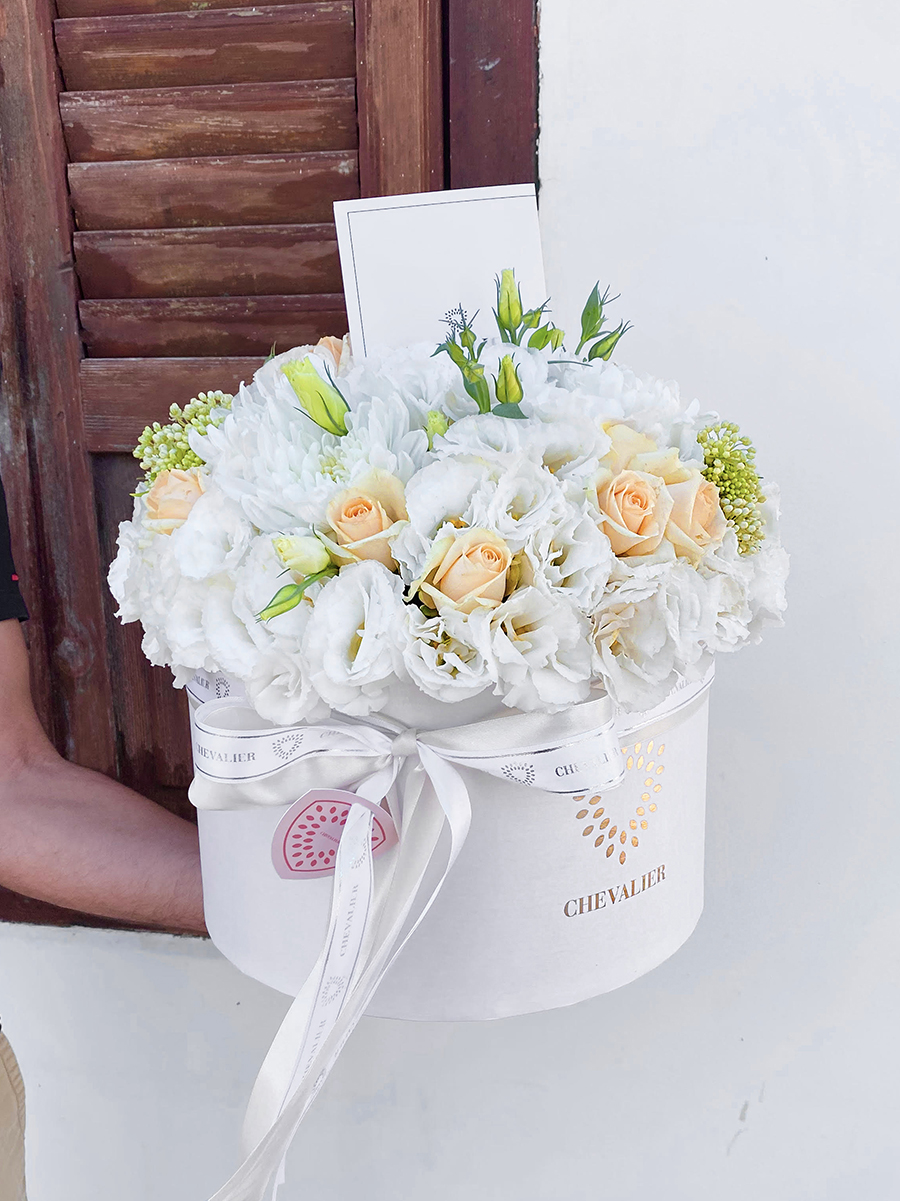 קופסת פרחים ענקית ומרשימה, המשלבת מגוון רחב של פרחים בגווני לבן ואפרסק, השזורים זה ובזה ויוצרים הרמוניה מוחלטת.