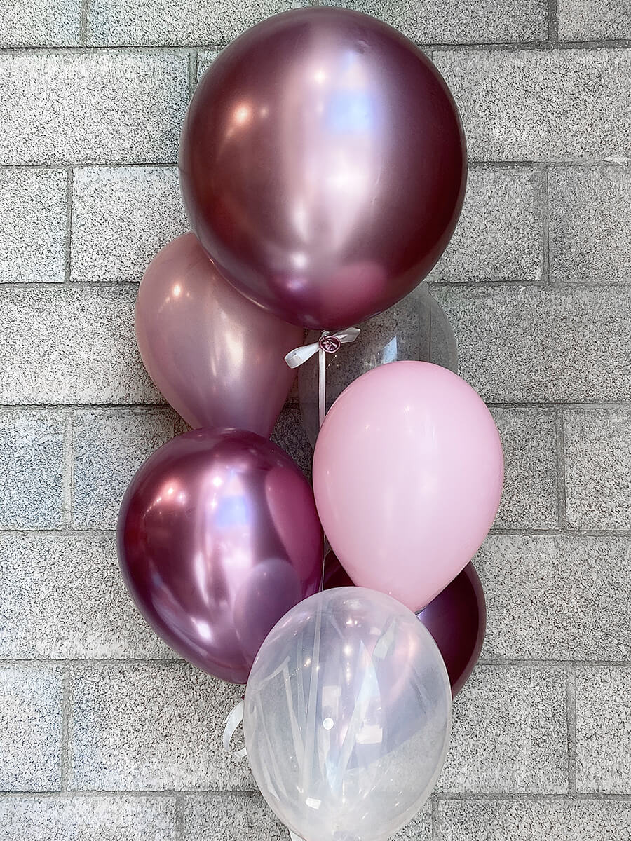 זר בלונים המכיל בגלון כרום גדול בצבע סגול, 2 בלוני כרום בינוניים בצבע סגול, 2 בלונים ורודים ו- 2 בלונים שקופים.