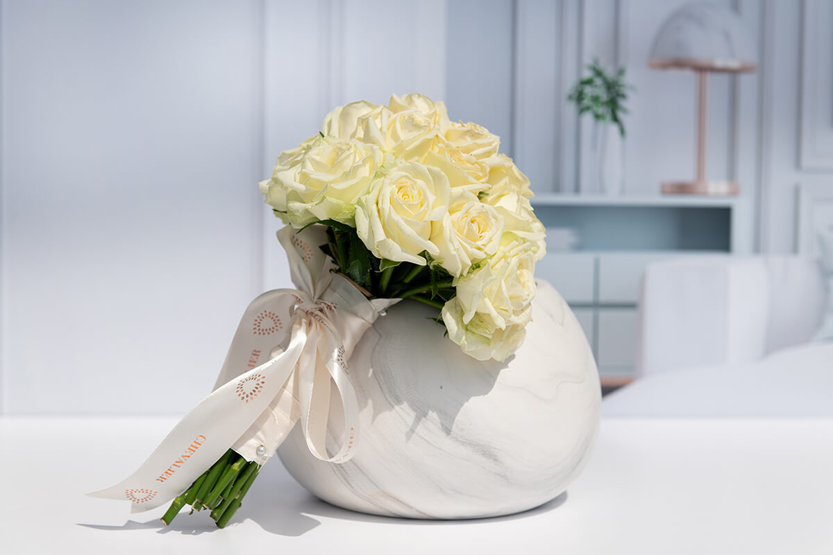 זר כלה אצילי וקלאסי שזור ב- 25 ורדים פתוחים ועדינים בצבע קרם.