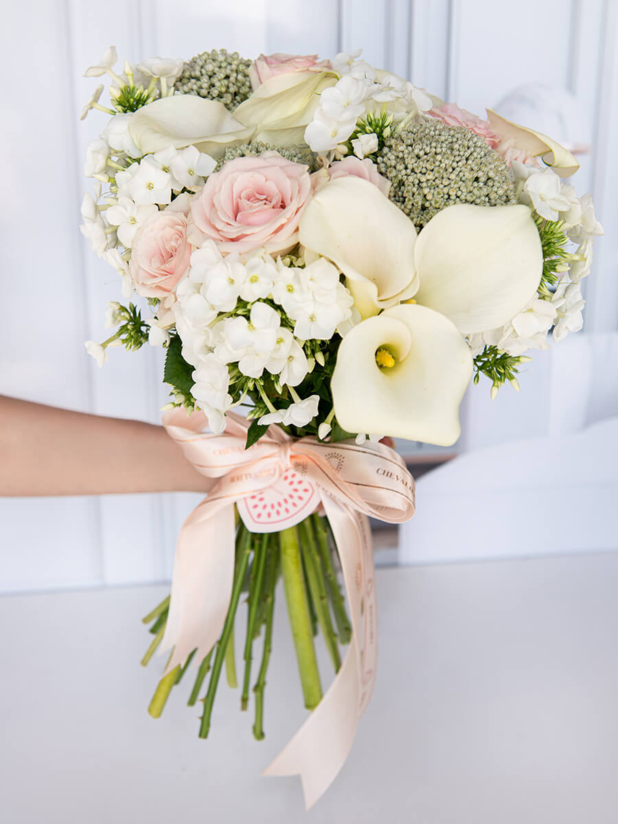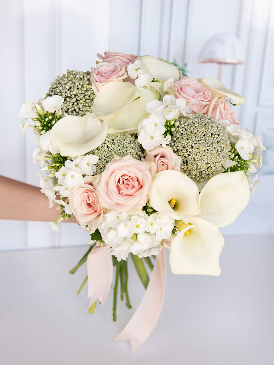 זר פרחים מלכותי, עשיר ורומנטי, בגווני ורוד ולבן (גודל הזר לבחירתך), המכיל קאלות לבנות היוצרות פרח עשיר וענק, ורדים בצבעי ורוד בייבי, פלוקסים לבנים ועוד.