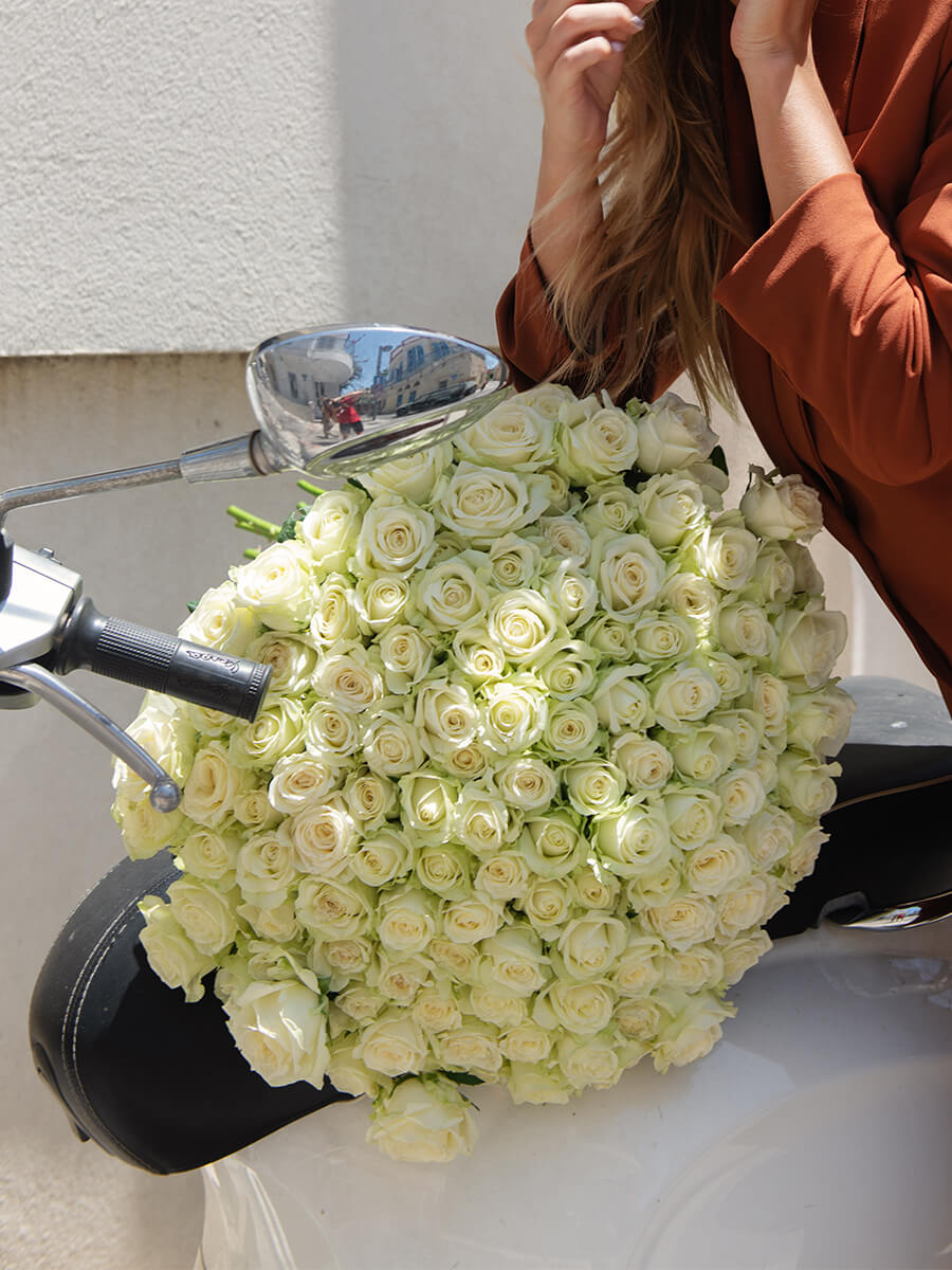 זר ורדים עצום ועוצר נשימה, בצבע לבן – קרם, מרשים למראה, המכיל בין 100 ל- 200 ורדים ע"פ בחירתך.