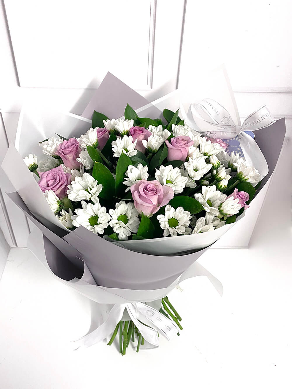 זר המכיל 11 ורדים בגווני סגול/ורוד (בהתאם למלאי החנות) וחרציות.