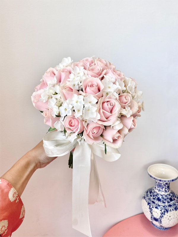 זר רומנטי, עגול ועדין המשלב ורדים ורודים עדינים ופלוקס לבן.