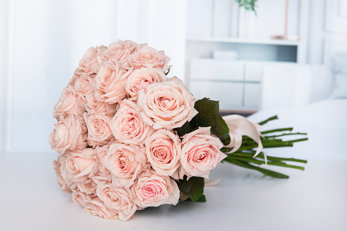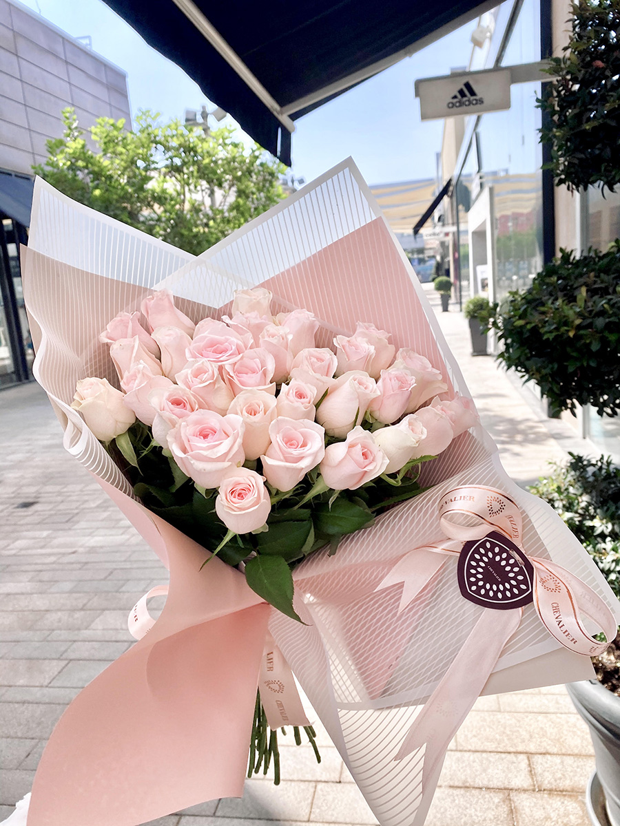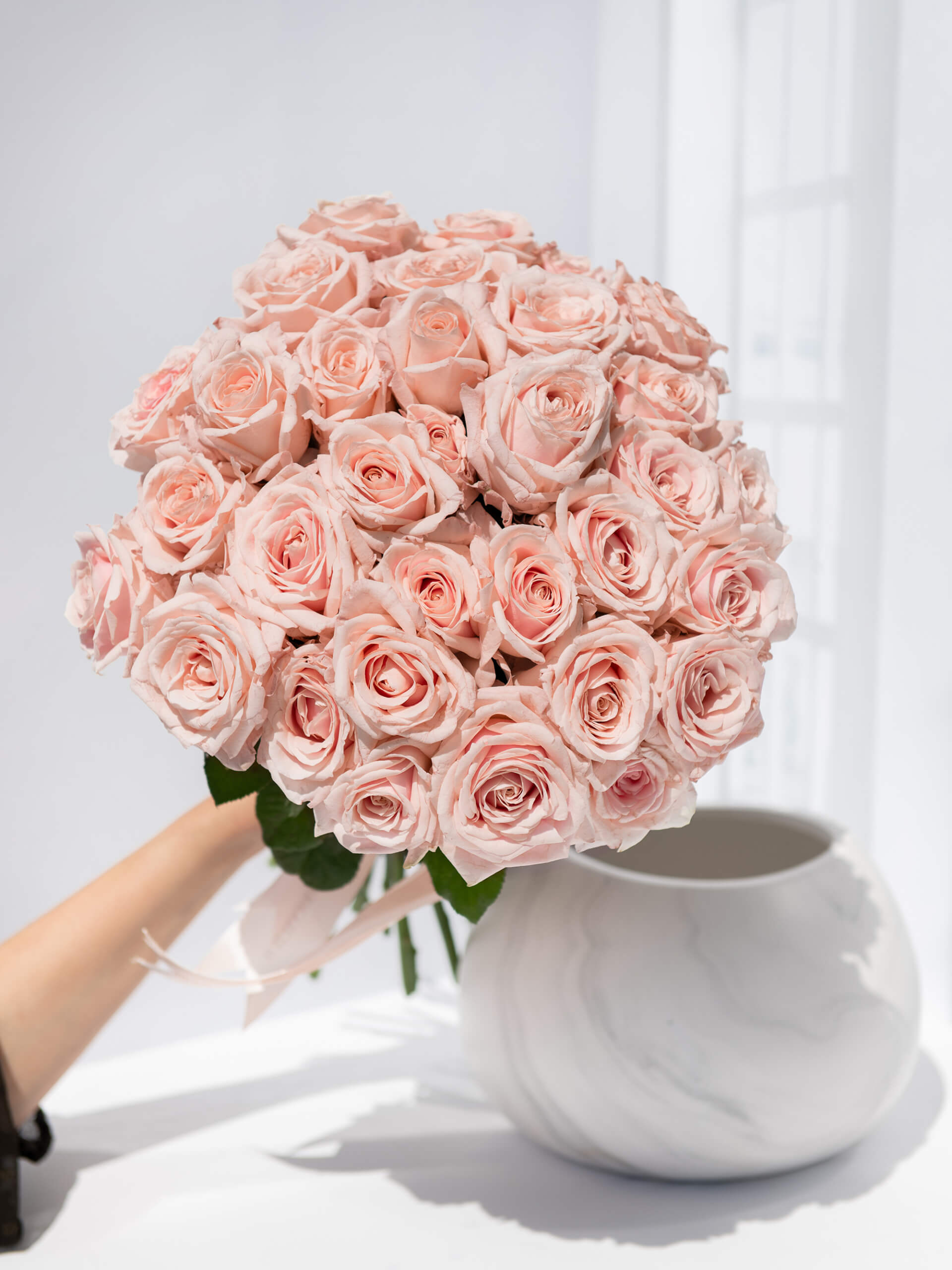 זר פרחים עדין ואלגנטי, מלא בורדים רומנטיים בצבע ורוד (כמות הורדים משתנה בהתאם לבחירתך).