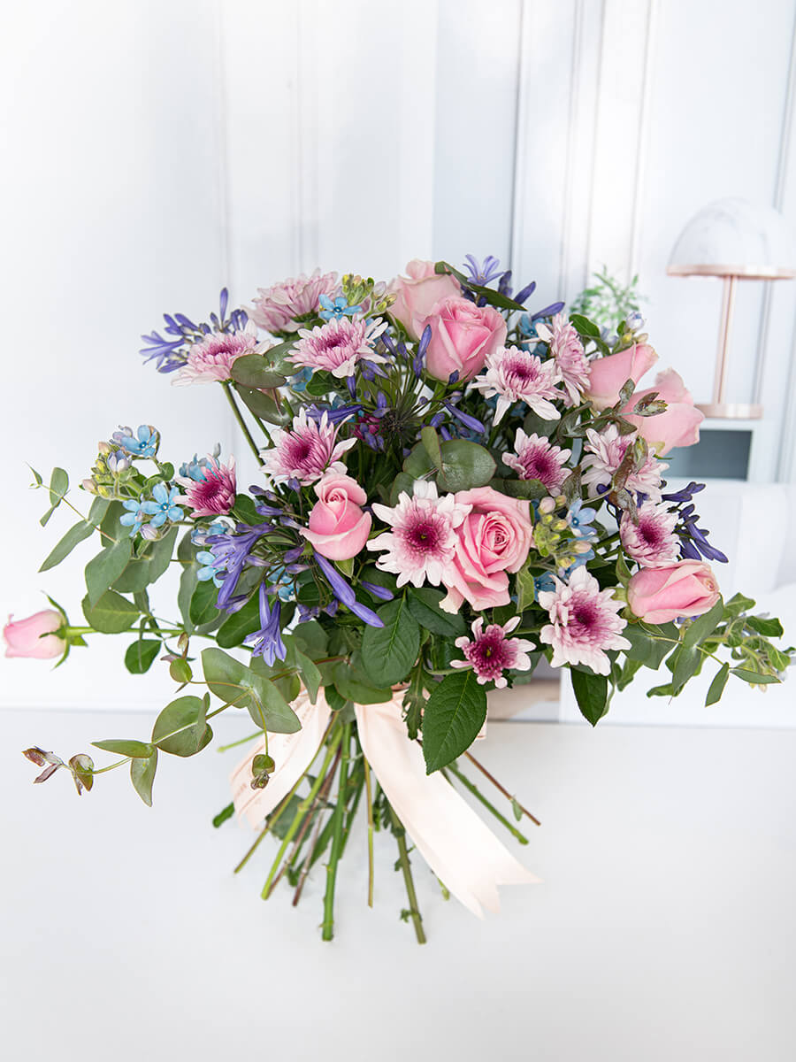 זר צבעוני וקסום מלא בשלל ורדים בגווני ורוד, טווידה תכלת, חרציות, ועוד.