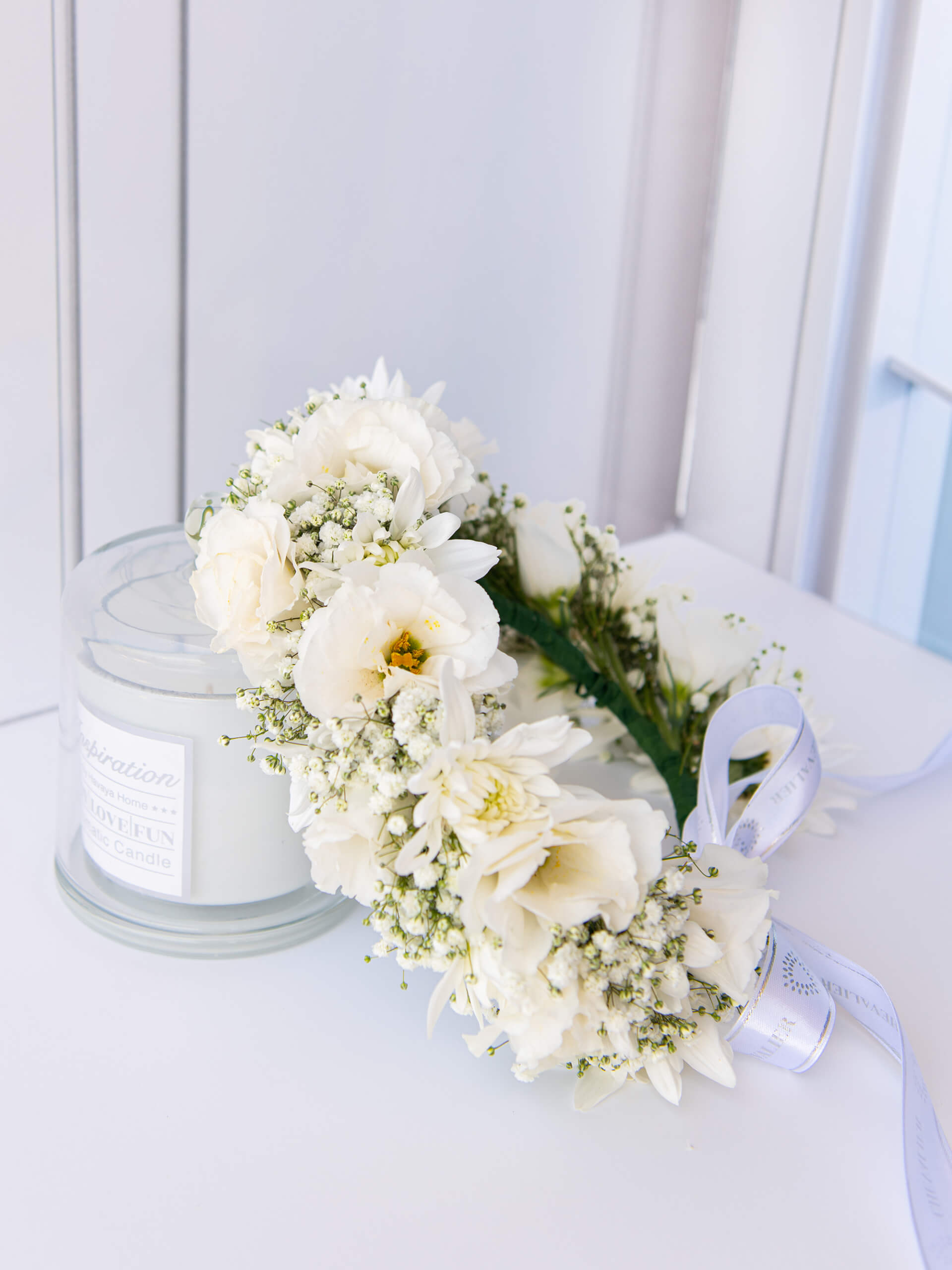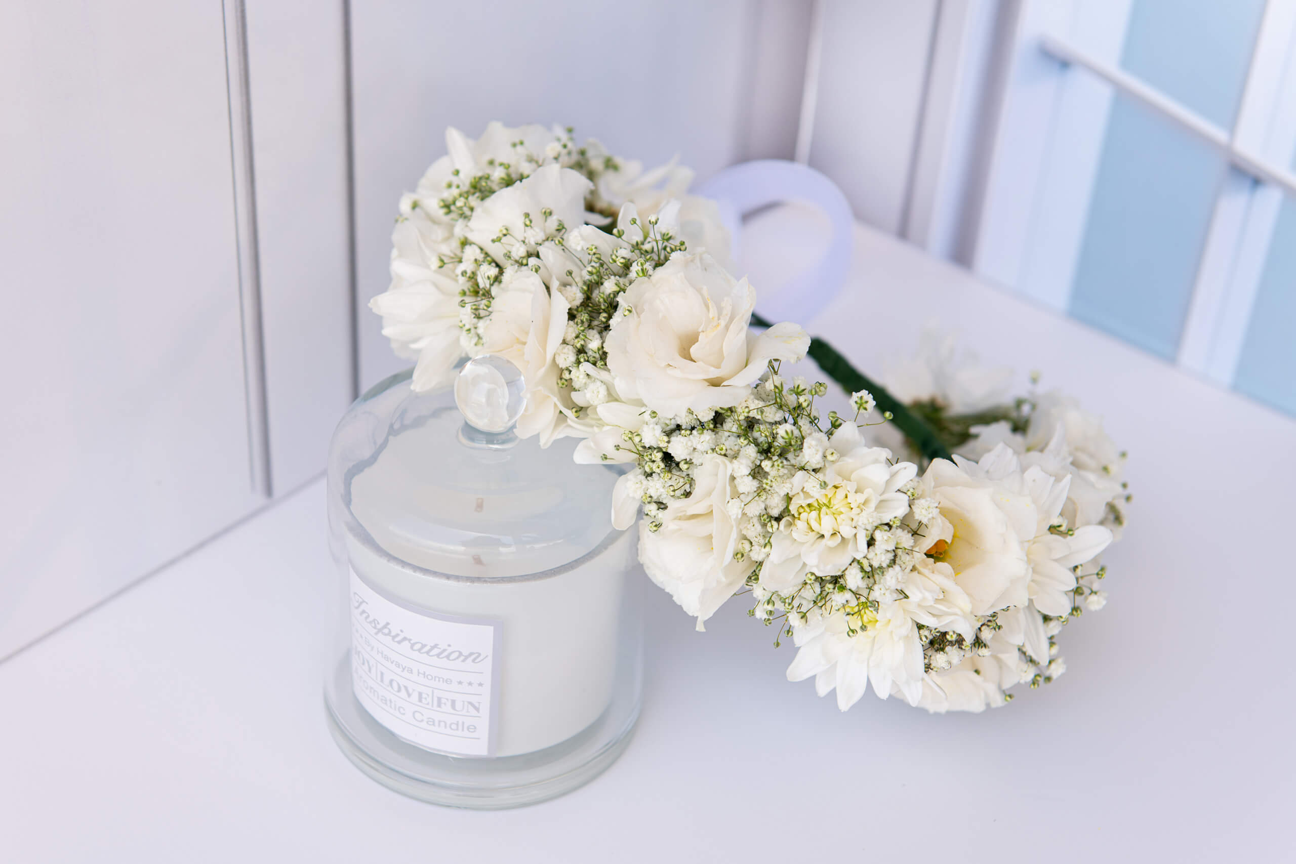 סידור ראש יפייפה ושופע, שזור בפרחי ליזיאנטוס וחרציות בצבע לבן.
