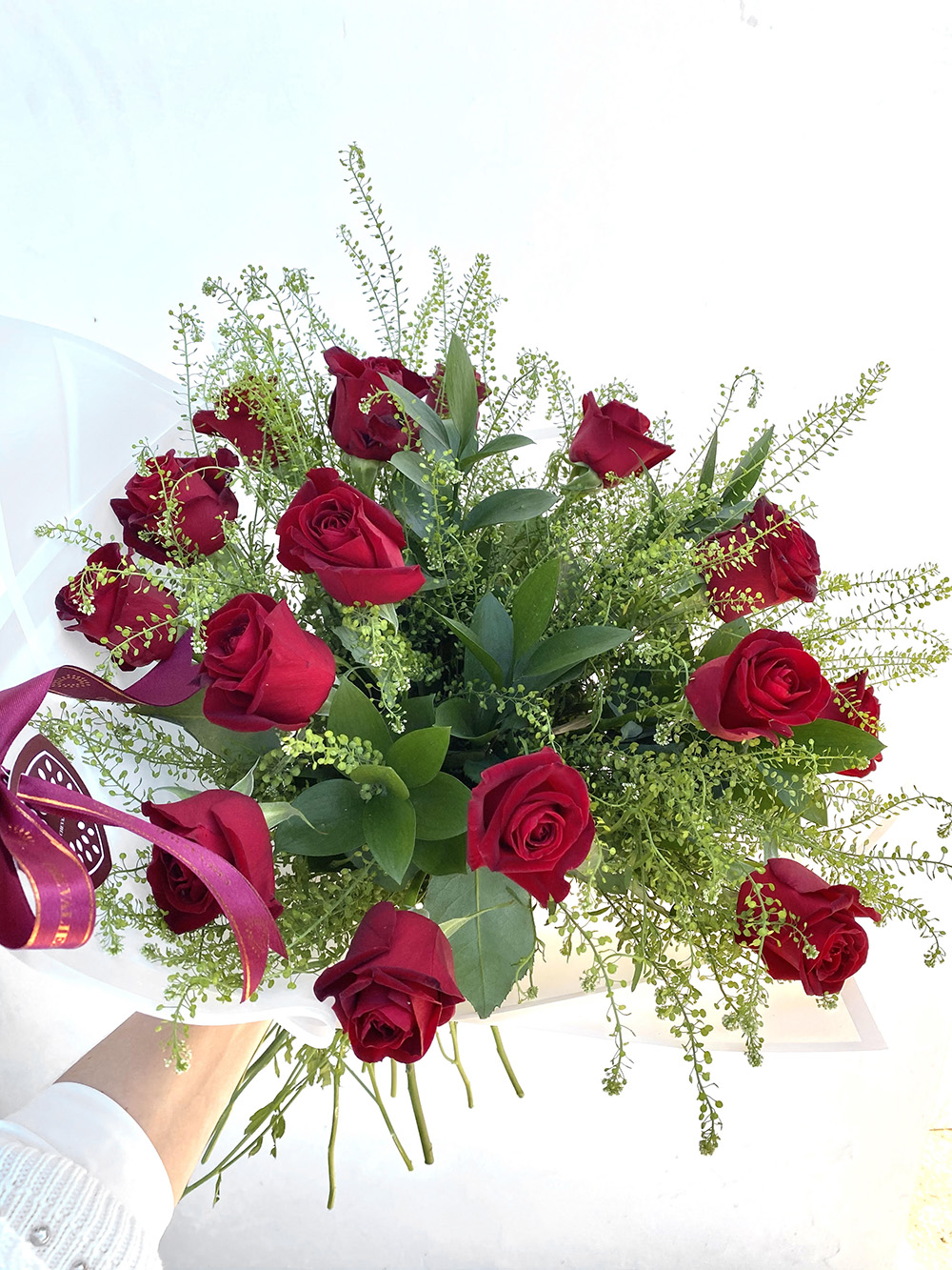 זר פרחים מהמם ורומנטי המשלב בצורה קסומה ורדים אדומים וירק עופרים, מגיע עטוף בנייר איכותי עמיד במים, ובסרט עדין, ומלא בסטייל.