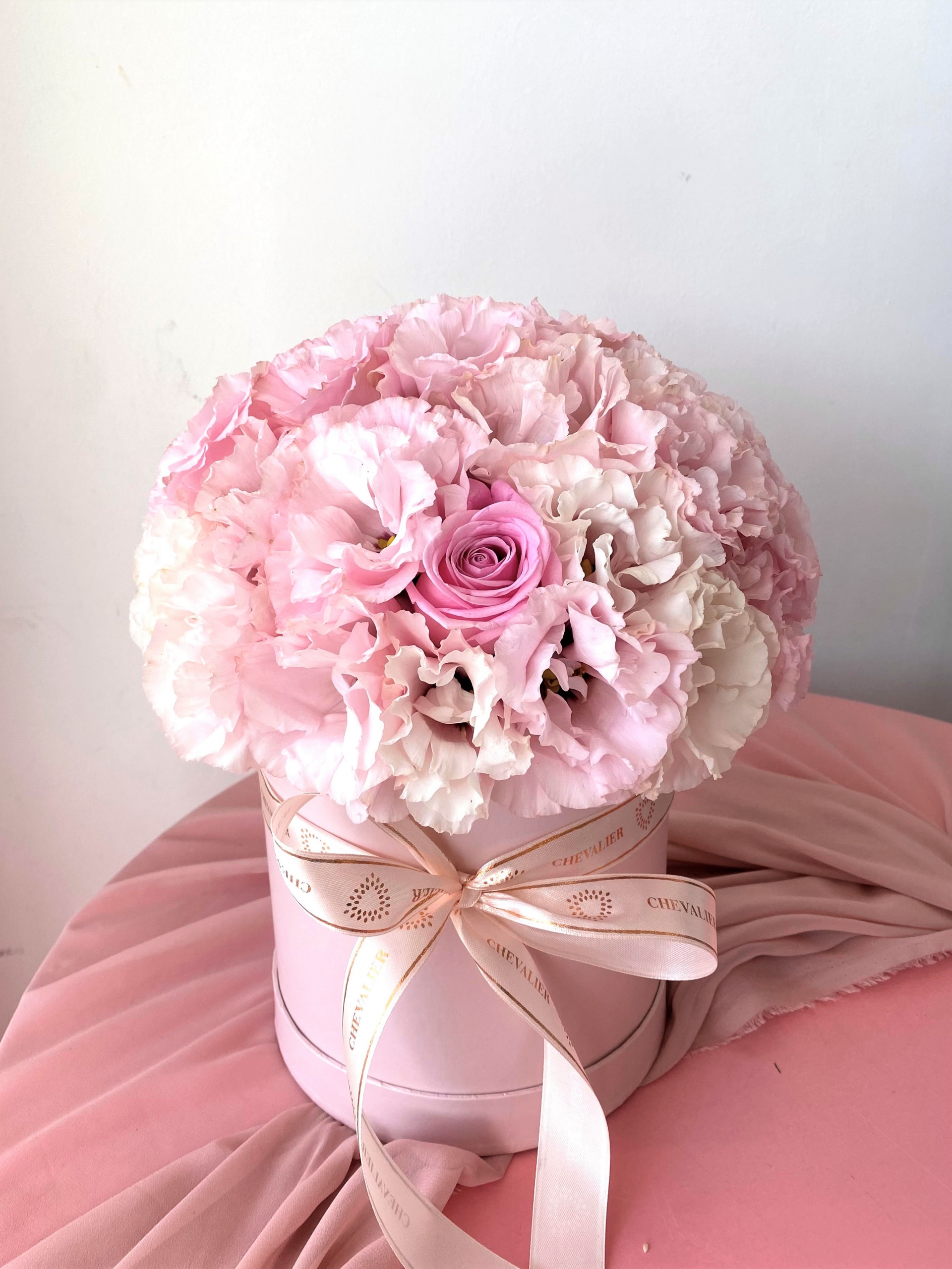 סידור עגול וגבוהה קסום ונקי בגווני ורוד עם פרחי העונה וסרטים רומנטיים.