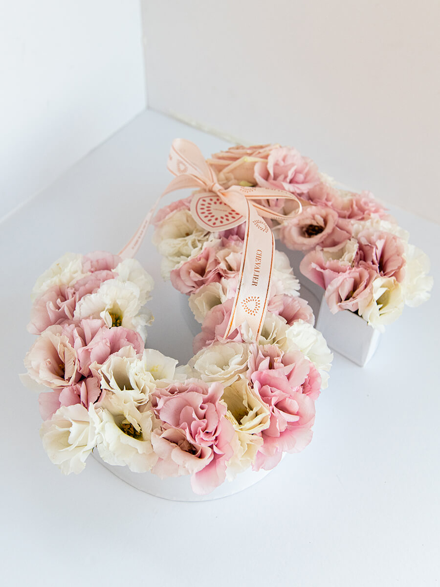 סידור אות לבחירה המפוצצים בפרחי ליזיאנטוס לבנים וורודים.