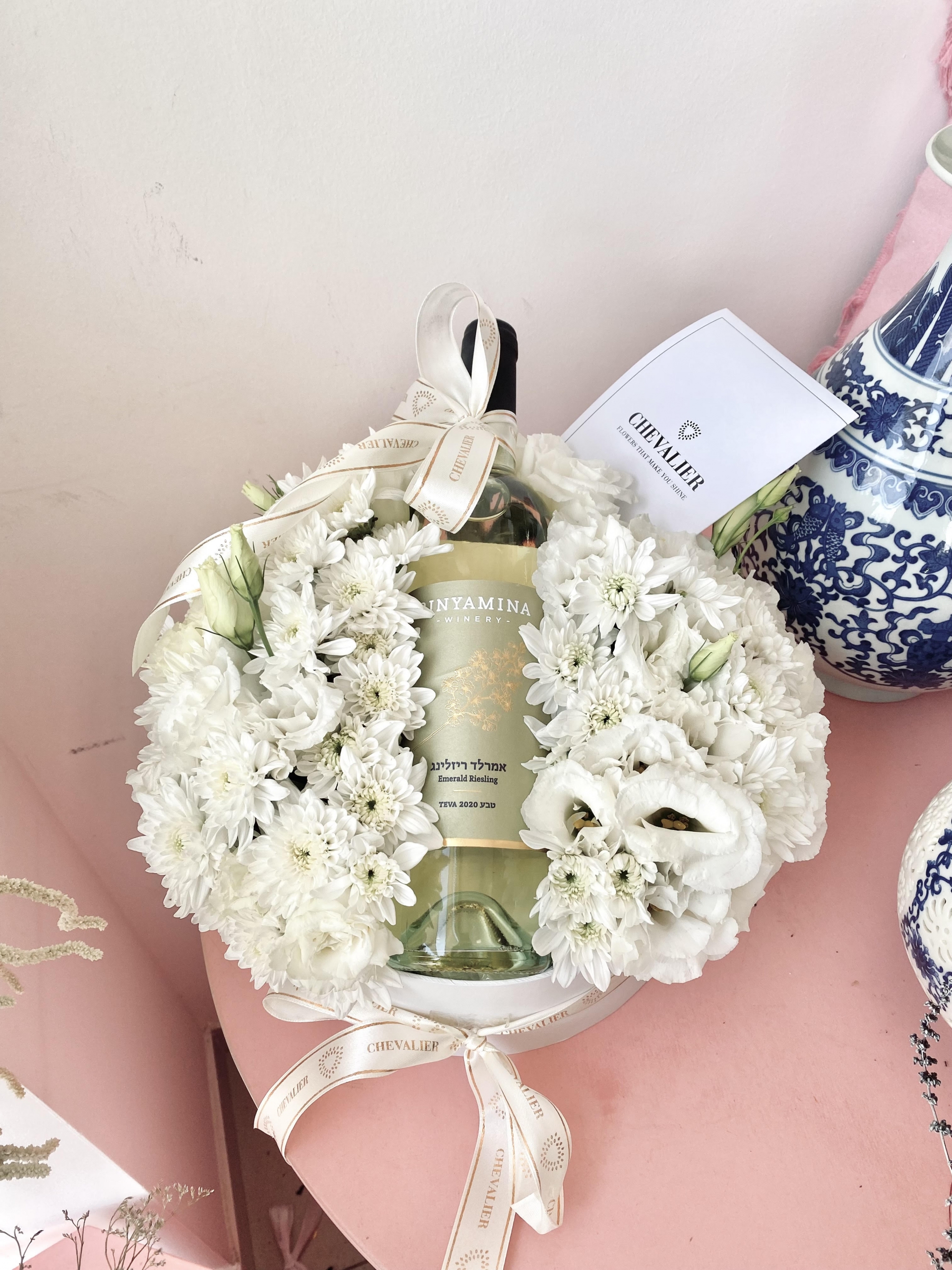 סידור עגול קסום בצבעי לבן המכיל פרחי העונה, הסידור מגיע עם יין לבן וסרטים מלאים בסטייל.