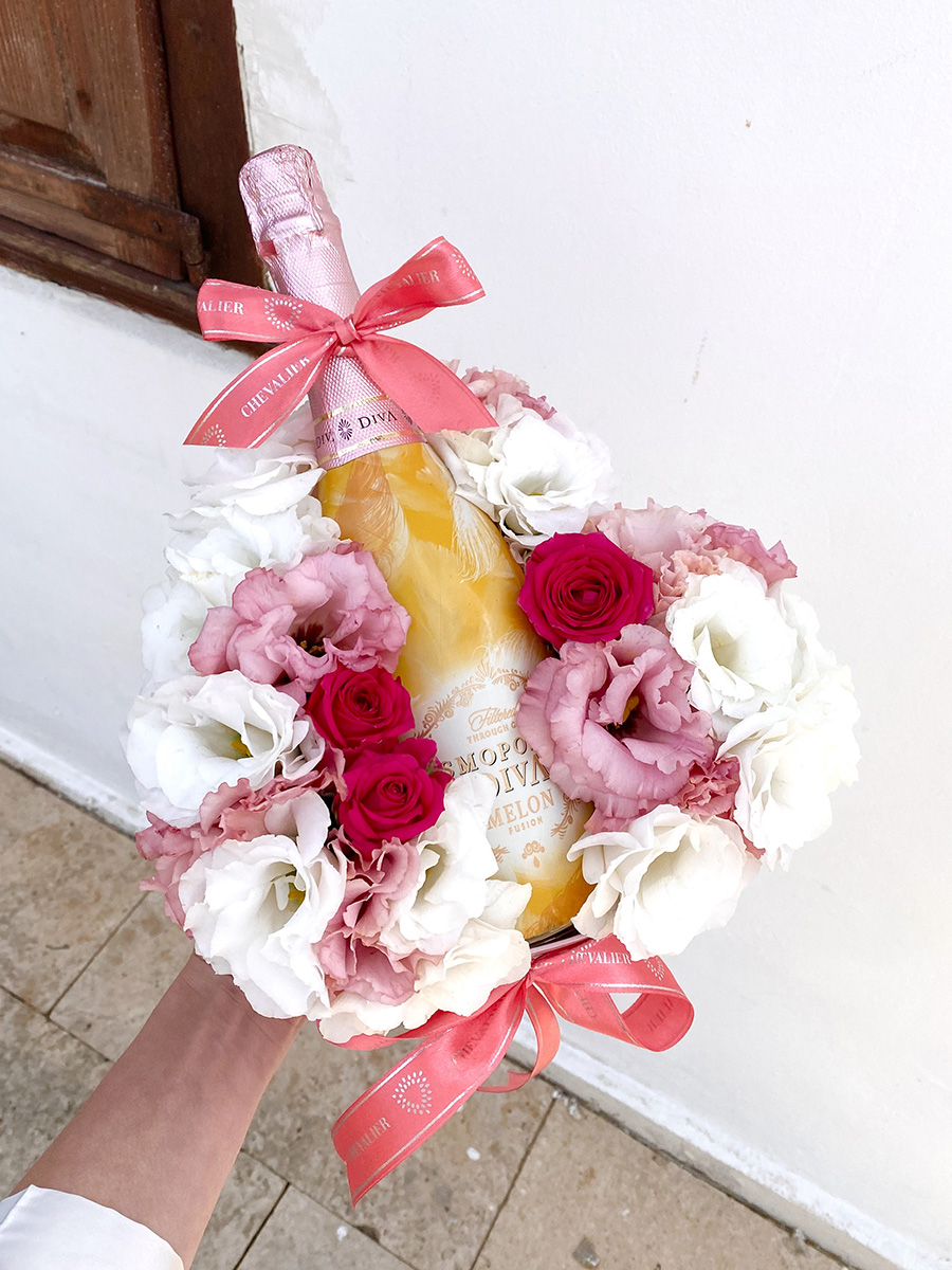 סידור קופסת לב קטנה עם שמפניית " קוסמופוליטן דיווה" המשלב בתוכו פרחי ליזיאנטוסים ורודים ולבנים וורדי פוקסיה .