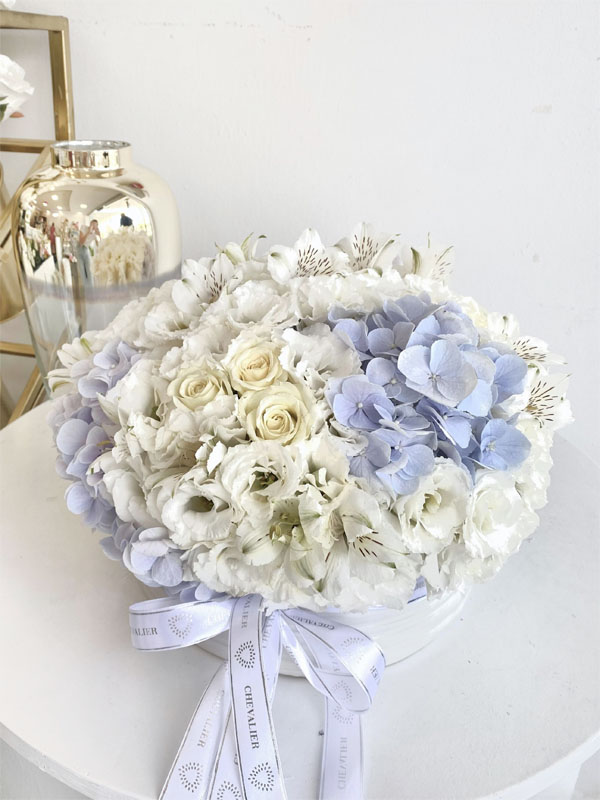 סידור עגול בכלי חרסינה עם פסים לבנים משלוב פרחים מרהיבים בגווני לבן, קרם ותכלת