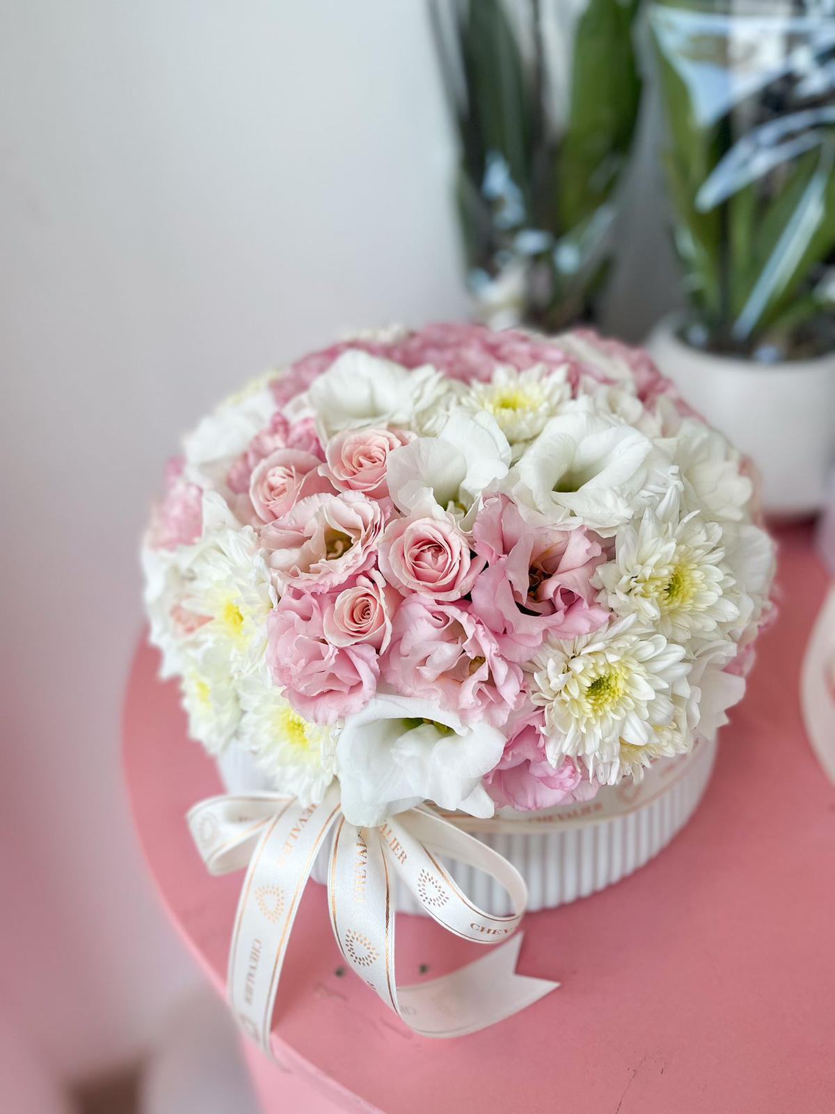 סידור עגול בכלי חרסינה לבן משלוח בפרחים בגווני צהובף לבן וורוד.