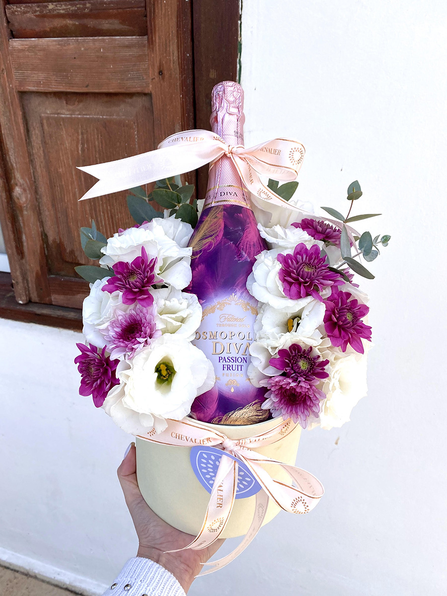 סידור קופסא עגולה הכוללת בתוכה שמפניית "קוסמופליטין דיווה", חרציות סגולות וליזיאנטוסים לבנים עם ניצנים של אקליפטוס.