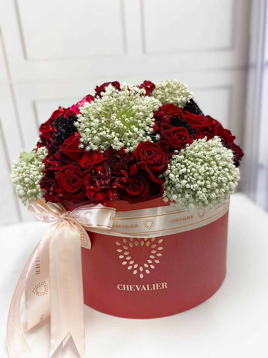 קופסת פרחים ענקית שחלומה של כל אישה לקבל, שופעת ורדים אדומים רעננים, בשילוב פרחים נוספים שיוצרים סידור אלגנטי ורומנטי.