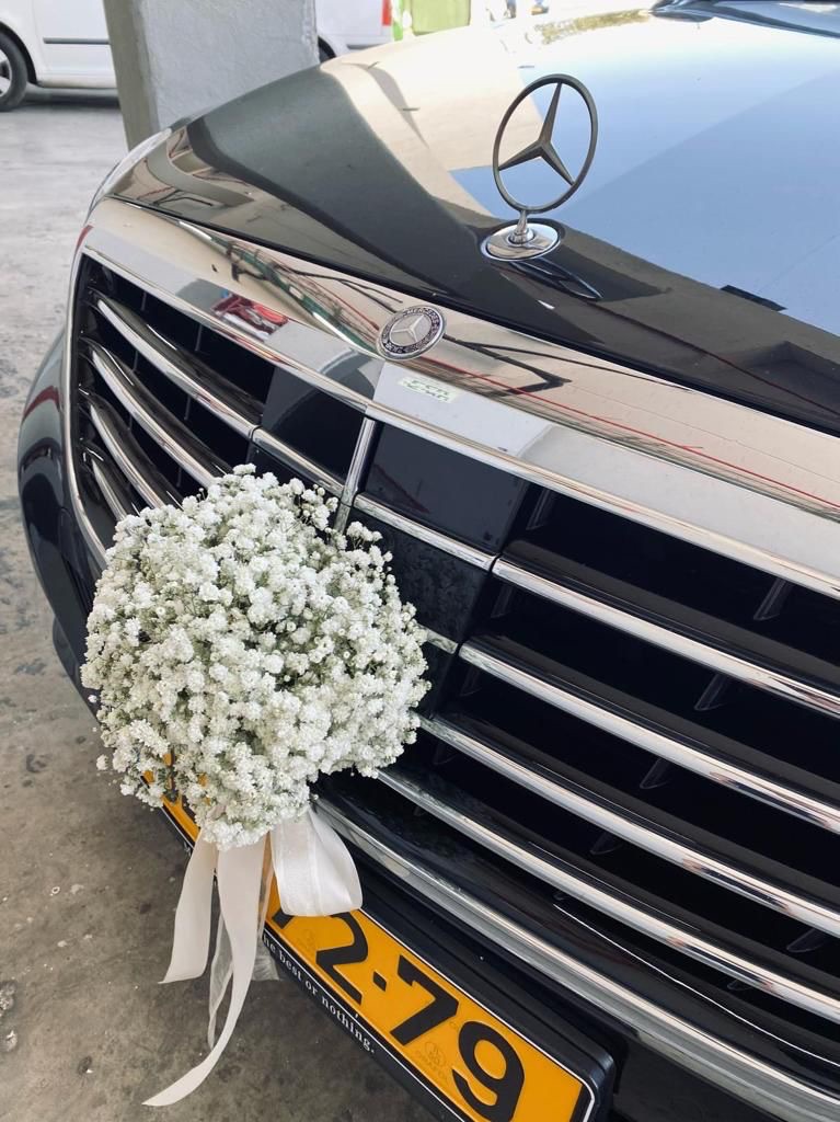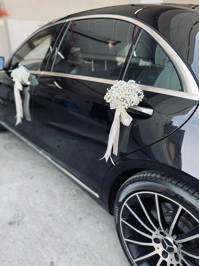 קישוט רכב עדין ורומנטי המורכב מ- זר גיבסנית ופפיון לכל ידית (4 ידיות) וזר גיבסנית ופפיון לקדמת הרכב.