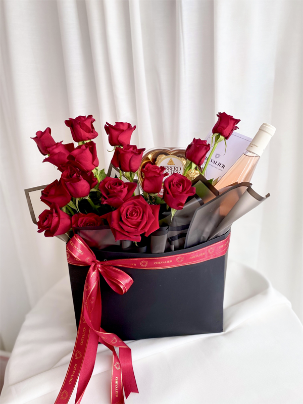 מארז האהבה שלנו הכי רומנטי שיש!! יש בו הכל, סידור ורדים טבעי ומרשים, המשלב שוקולד פררו רושה ויין רוזה באריזה מלאה בסטייל!!!
